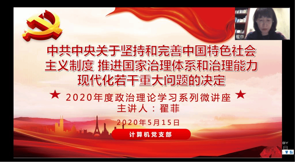 2020年5月15日,根据best365足球官网教职工政治理论学习要求及第二季度基层党组织“两学一做”学习教育安排,为保障疫情防控期间支部与教研室工作的正常进行,进一步提高教职工思想政治素质和理论水平,推进学校教育教学改革发展,计算机党支部和计算机教研室,立足本职、多措并举,充分利用线上多元化的方式,积极开展教职工政治理论云学习,为疫情防控时期,稳步推进教学科研工作提供强有力的思想保障和精神动力。会议由计算机党支部书记翟菲主持。郑小松、翟菲、张晓帆、宗东升四位党员教师分别以《习近平在全国教育大会上的讲话》、《中共中央关于坚持和完善中国特色社会主义制度 推进国家治理体系和治理能力现代化若干重大问题的决定》、《用新时代中国特色社会主义思想铸魂育人、贯彻党的教育方针落实立德树人根本任务》、《把思想政治工作贯穿教育教学全过程》为主题,为教研室全体教师讲授微党课。