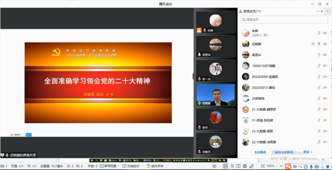 为深入学习贯彻党的二十大精神,深刻领会和把握党的二十大精神的思想精髓和核心要义,11月9日,best365足球官网党委召开线上政治理论中心组(扩大)学习会,专题学习贯彻党的二十大精神,邀请省委党校迟晓蕾副教授做题为“全面准确学习领会党的二十大精神”讲座,学院全体教师及学生党员参加会议,学院党委书记吴恩华主持会议。