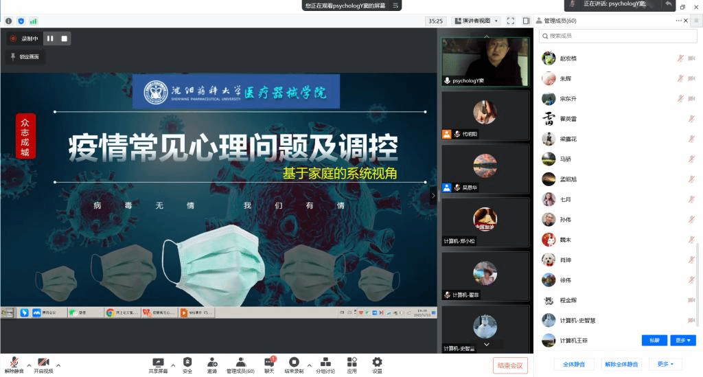 为进一步缓解疫情防控期间全院教职工居家办公的心理压力,做好疫情期间的心理调适,提高心理健康水平,best365足球官网于4月13日,面向全院教职工开展线上心理健康讲座。本次讲座邀请到沈阳体育学院运动人体科学学院副教授,应用心理学博士窦广波,为全院教职工做题为《疫情常见心理问题及调控——基于家庭的系统视角》专题辅导讲座,学院全体教师参加了本次讲座。