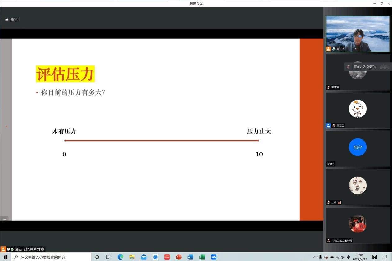 为做好疫情期间全院学生的心理健康服务工作,引导学生以积极正确的心态应对疫情,有针对性的进行防疫心理疏导,提升学生心理素质,4月12日19:00,best365足球官网学生工作办公室邀请沈阳建筑大学心理健康中心张云飞老师,面向学院全体学生开展了以《疫情封校期间的压力管理》为主题的线上心理讲座。
