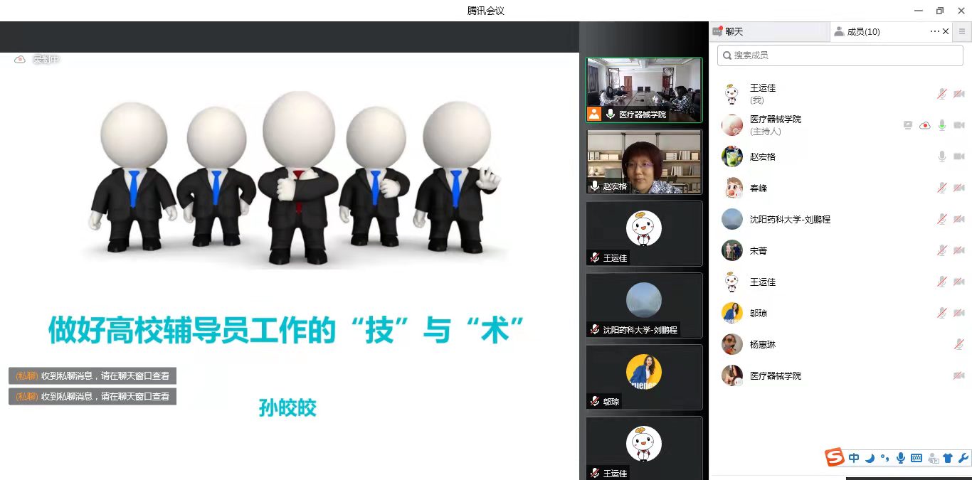 孙皎皎书记以“做好高校辅导员工作的技与术”为题,从辅导员的角色现状与特点、做好辅导员工作—“技”、做好辅导员工作—“术”和辅导员工作案例分享几个方面与大家分享了她16年的辅导员工作经验。孙书记结合自己的工作经历和目前国家及社会对辅导员工作的要求,从使命崇高、定位具体、责任重大和情感纠结的维度向大家介绍了辅导员的角色现状与特点。她结合实际案例向大家强调要善于掌握和运用辅导员所需技能,提升履行辅导员岗位职能的业务能力,从而更好的解决问题、完成工作任务,减轻辅导员工作带来的倦怠感。还要认真研究辅导员工作的方法和策略,面对4年大学生教育服务引导甚至整个辅导员职业生涯做好战略性的规划,从而形成辅导员个人教育管理的特色或成效,完成业务型向专家型转变。最后,孙皎皎书记就辅导员们提出的问题进行答疑解惑,总结了自己从事辅导员工作的心态与整体感悟,鼓励大家要热爱这份工作,全身心的投入其中,才能有所收获。
