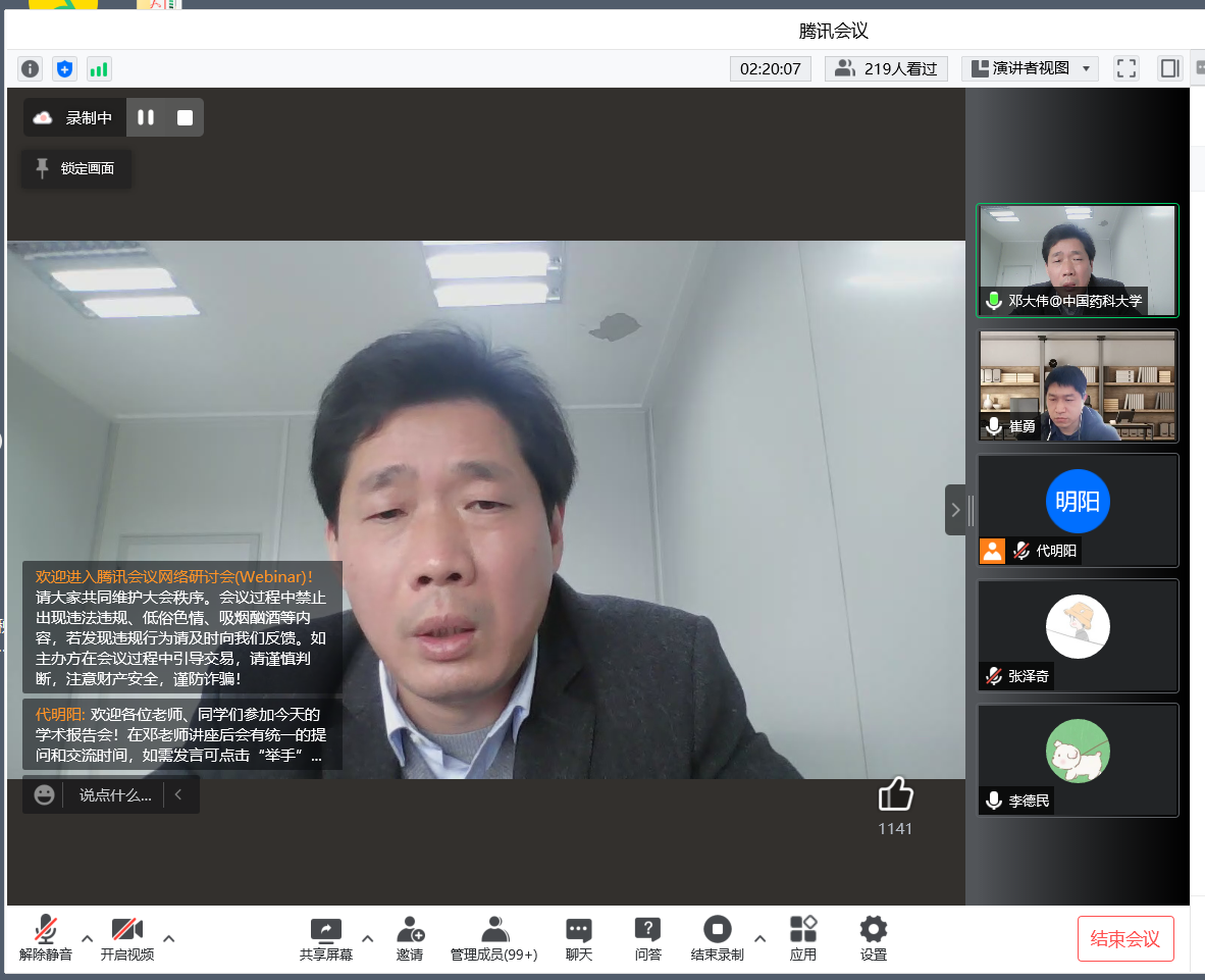 3月31日,由研究生院、辽宁省药学研究生创新与学术交流中心、best365足球官网联合举办的“沈药无涯论坛”第274讲——邓大伟教授学术报告会于线上如期举行。会议邀请到中国药科大学邓大伟教授做了题为《荧光量子点及其生物医学应用》的学术报告。报告会由best365足球官网副院长崔勇主持,200余名师生在线收看。