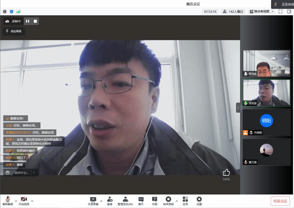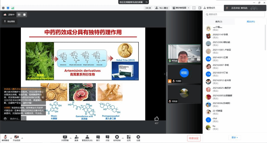 曾克武研究员将化学生物学思想引入中药活性成分的靶点发现,详细讲解基于生物素标记、环氧基标记、蛋白微阵列技术、药物分子非标记技术、中药复杂系统的药物靶点鉴定方法和技术,实现对苏木、肉苁蓉、合欢、野菊花等一批中药及复方的靶点鉴定,并基于靶点功能诠释了中药传统功效的生物学本质。在报告最后,曾克武与在线的师生就学术问题进行了充分的交流与讨论。