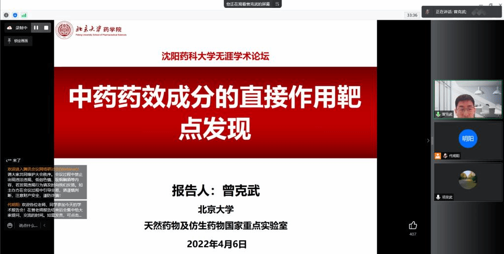 4月6日,由研究生院、辽宁省药学研究生创新与学术交流中心、best365足球官网联合举办的“沈药无涯论坛”第278讲——曾克武学术报告会于线上如期举行。会议邀请到best365官网66K校友、北京大学曾克武研究员做题为《中药药效成分的作用靶点发现》的学术报告。报告会由best365足球官网副院长项荣武主持,200余名师生在线收看。