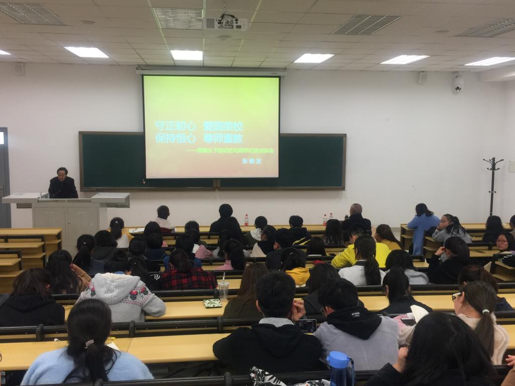 张殿发老师的宣讲题目是《守正初心 爱国荣校 保持恒心 尊师重教——用镜头下的记忆与同学们谈点体会》,张老师用他在学校工作期间拍摄的大量的照片带着同学们追寻沈药精神,从过去的沈药校园、现在的校本部到建设中的新校区,在照片中讲述学校的发展,沈药人的尊师重教、爱国荣校、勤奋学习、艰苦奋斗的优良品质,激励当代大学生要志存高远,时刻牢记沈药精神。