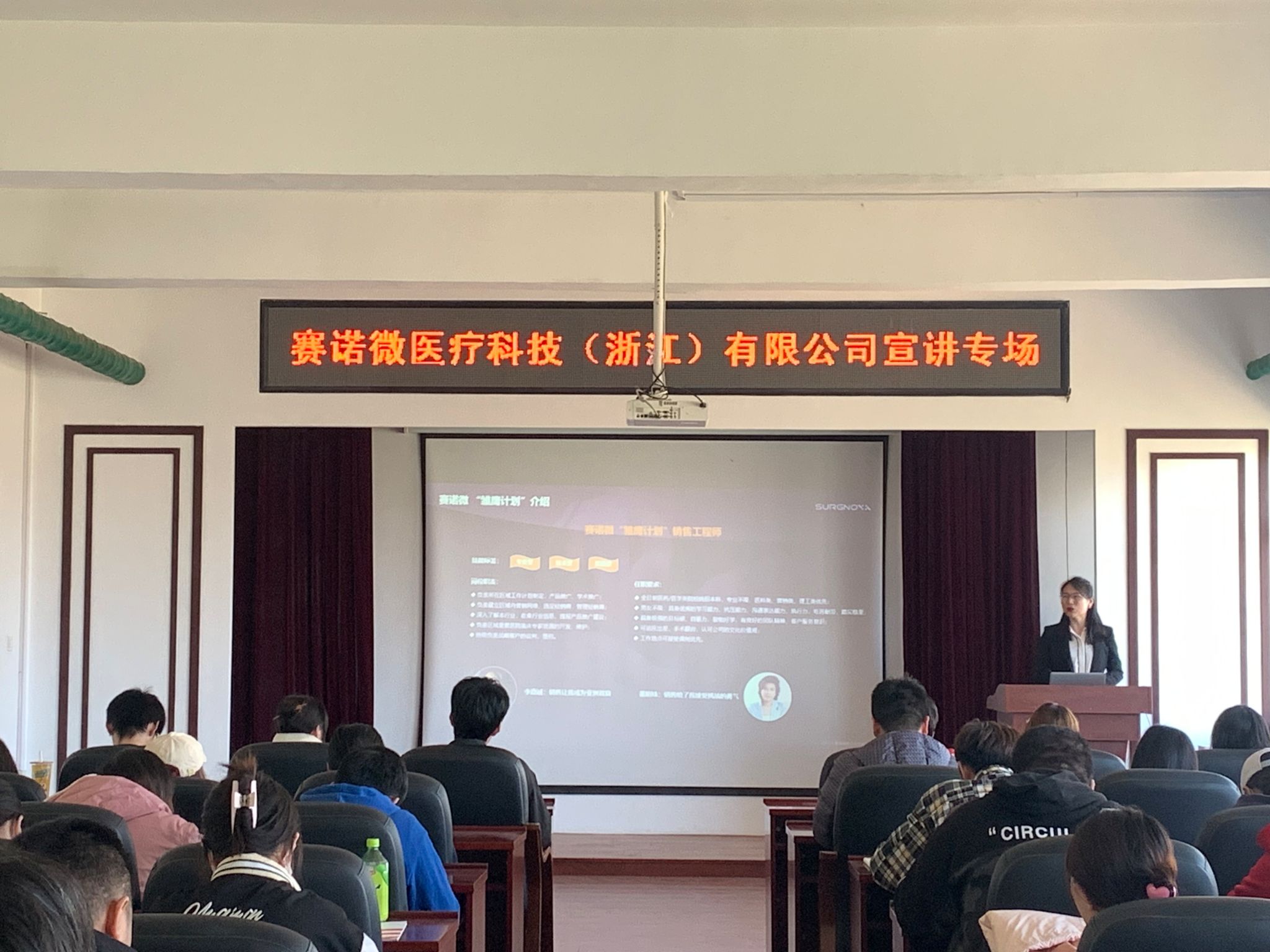 为充分发挥校园招聘主渠道作用,帮助毕业生“就好业”2023年4月26日的下午,best365足球官网邀请赛诺微医疗科技(浙江)有限公司到学院举行春季招聘专场,为毕业生提供“点对点”就业岗位推荐服务,学院全体毕业生及其他年级有就业意向的学生参加了此次招聘宣讲会。